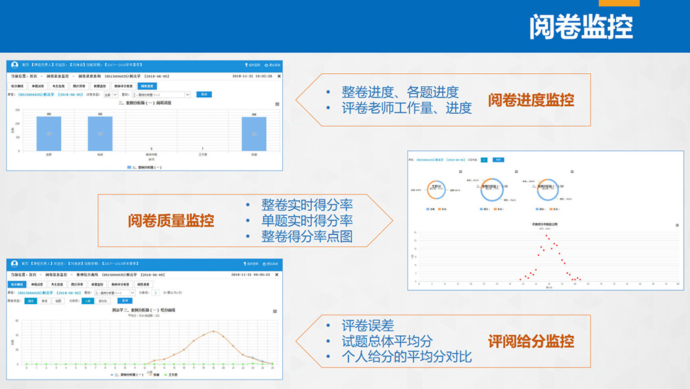 1. 閱卷進度監控: 顯示試題數、閱卷教師信息、全部和個人閱卷任務數、已閱份數、未閱份數、仲裁份數;顯示整卷進度、各題進度、評卷教師工作量及進度;